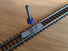 The jig clips over the sleepers and positions a hole in the centre of the sleeper. Now all you need to do in drill a small hole through the sleeper at this point and you can remove the jig and fit the track pin